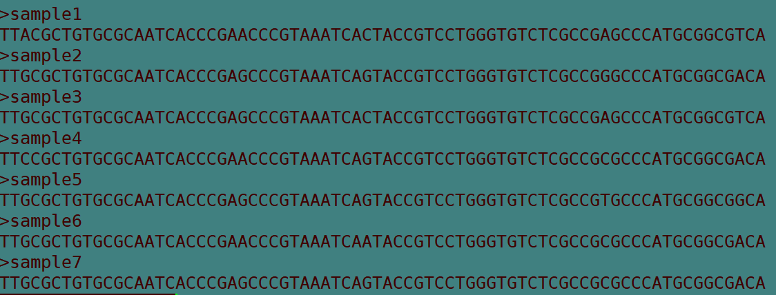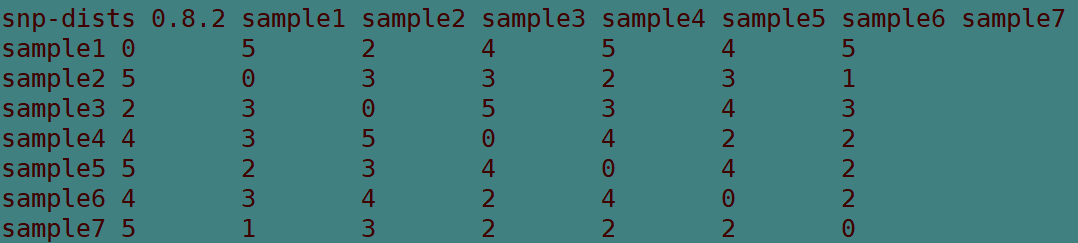 输出结果:tab键分割的距离矩阵,第一行和第一列均为样本名称,行与列交叉处的数字表示两个样本间差异的SNP数目