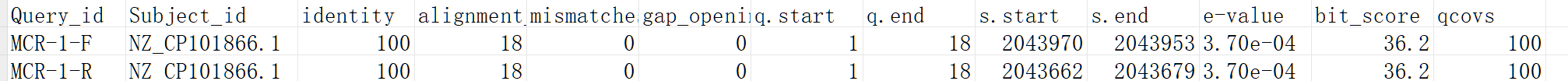 query id:查询序列ID标识;refer id:参考序列ID标识;identity (%):序列比对的一致性百分比;alignment length:符合比对的比对区域的长度;mismatches:比对区域的错配数;gap openings:比对区域的gap数目;q.start:比对区域在查询序列上(query id)的起始位点;q.end:比对区域在查询序列上(query id)的终止位点;s.start:比对区域在参考序列上(refer id)的起始位点;s.end:比对区域在参考序列上(refer id)的终止位点;e-value:比对结果的期望值,将比对序列随机打乱重新组合,与数据库进行比对,如果功能越保守,则该值越低;bit score:比对结果的bit score值;qcovs:查询的覆盖率。