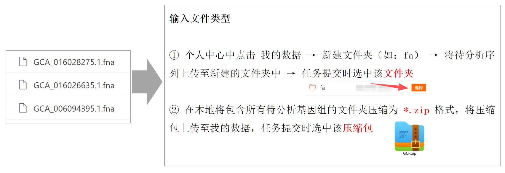 包含待分析序列(FASTA格式)的文件夹或 *.zip 压缩包,文件名中避免出现空格或中文字符,若需分隔符,建议使用下划线 '_'
