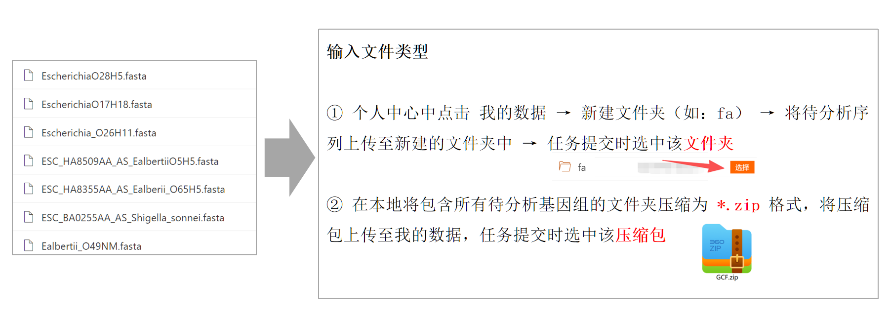 包含待分析序列(FASTA格式蛋白序列)的文件夹或 *.zip 压缩包,要求每个分离株基因组序列文件后缀为 fasta/fna/fa/faa,文件名中避免出现空格或中文字符,若需分隔符,建议使用下划线 '_'